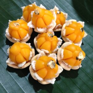 One of the most elegant dishes and sweets, its name holds the meaning of success and to be the best. Usually gives as a blessing meaning of high achievement to receivers. It’s made of mung bean flour, coconut milk, sugar, and egg yolks, the mixture is slow-cooked until smooth. Shaped into floral design and topped with gold leaf. It’s still hard to find nowadays since not many people know how to make it properly.