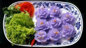 also known internationally as Steamed flower dumplings. It’s one of the most iconic snacks for royal cuisine, made with purple-hued rice flour filled with minced pork, chicken, or shrimp, then shaped into a flower as a symbol of beauty. It gives light sweet and savory tastes to get you ready for the main dishes.