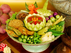 - Presentation: Thai Royal dishes always presented in elegance ways, food must be carved, shaped, or arranged artistically. They are often in the shape of flowers or mythical symbols.