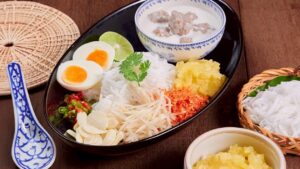 Fragrant rice in iced jasmine water, the menu was originally from Mon people and refined in the royal cuisine. The dish combined chilled jasmine-scented rice with side condiments like stuffed shallots, shredded sweet pork, shrimp paste ball, and fresh vegetables. Khao Chae is served during summer as a cooling dish that offers flavorful and refreshing.