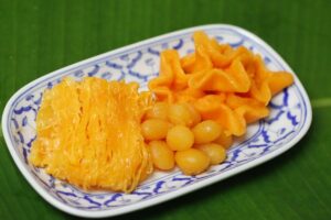 Mung bean fruit-shaped sweet, this one is a colorful and glossy sweet molded into tiny fruits and vegetables. It’s introduced from Portugal then adapted and perfected in the royal kitchen during Ayutthaya period. This is one of the most difficult sweets to make because you must mold each one to be precisely shape like fruits and vegetables by hand.