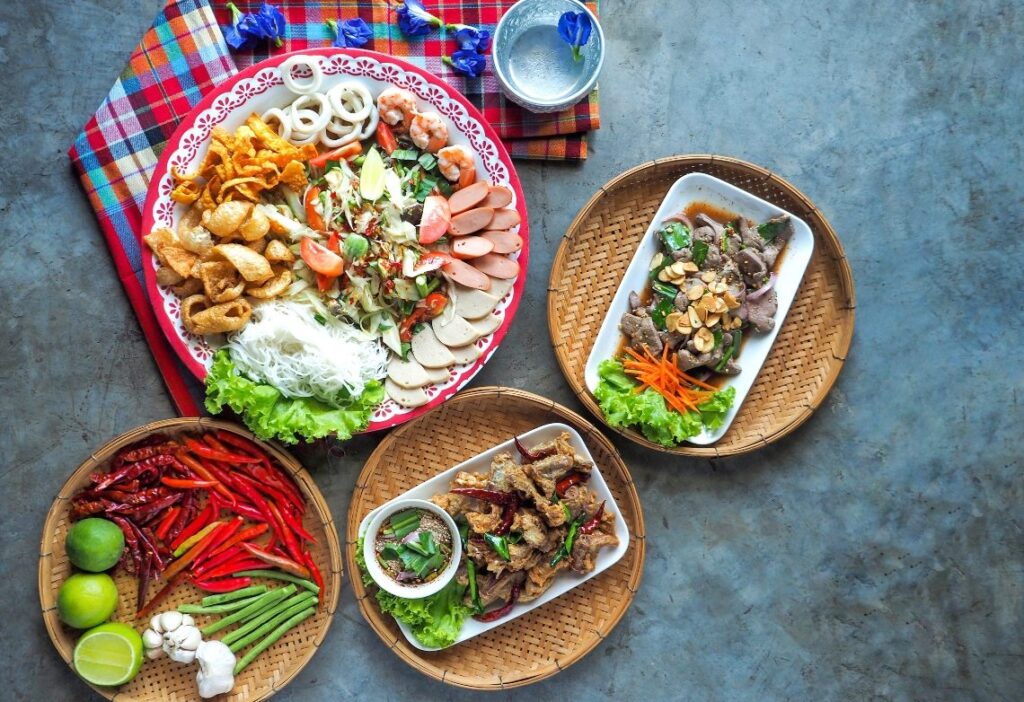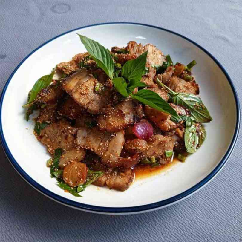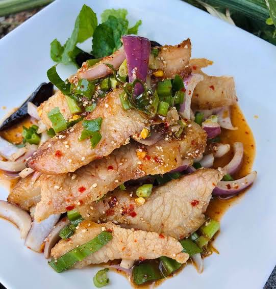 If you ever sit in an Isan Street stall you may wonder what’s the smoky smell, the answer is grilled pork neck it’s one of the food Thai people always order when they go to Isan Street stall. This dish is completely different from what you would imagine you would find in Isan stall, it’s not a spicy, hot, and hard to eat dish. This is a simple marinated pork neck grilled on charcoal and served with jaew sauce, and it’s one of the main protein dishes you can find in these stalls. When you combine grilled pork neck with Nam Tok (spicy salad), it elevates Nam Tok’s flavor to another level. The sweet and salty flavor from grilled pork neck works perfectly with the heat and balanced flavor of Nam Tok and when you eat it with sticky rice and flesh vegetables that is a perfect combination for this this. You can experience everything in a single bite and understand what Isan food represents.